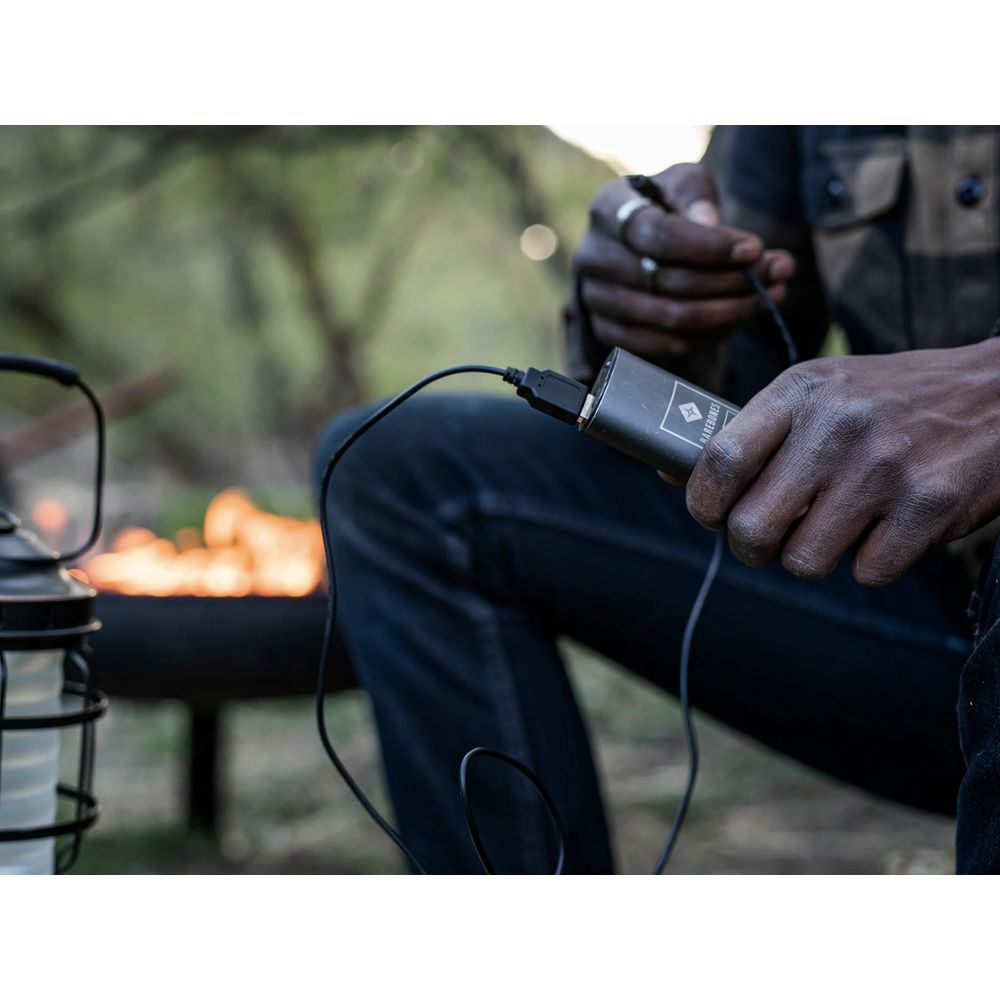De kleine lichte powerbank van Barebones is ideaal voor je kampeervakanties of weekendtripjes. De powerbank heeft een vermogen van 4400 mAh. De oplader is speciaal ontwikkeld voor de Barebones lampen met oplaadbare accu. Zokun je bijvoorbeeld de Edison Pendant lamp van Barebones op eenvoudige wijze van stroom voorzien en ben je verzekerd van ruim acht uur licht. De stevige behuizing is gemaakt van aluminium en is daardoor ook nog eens superlicht. De oplader is geschikt voor alle apparaten met een USB-aansluiting.