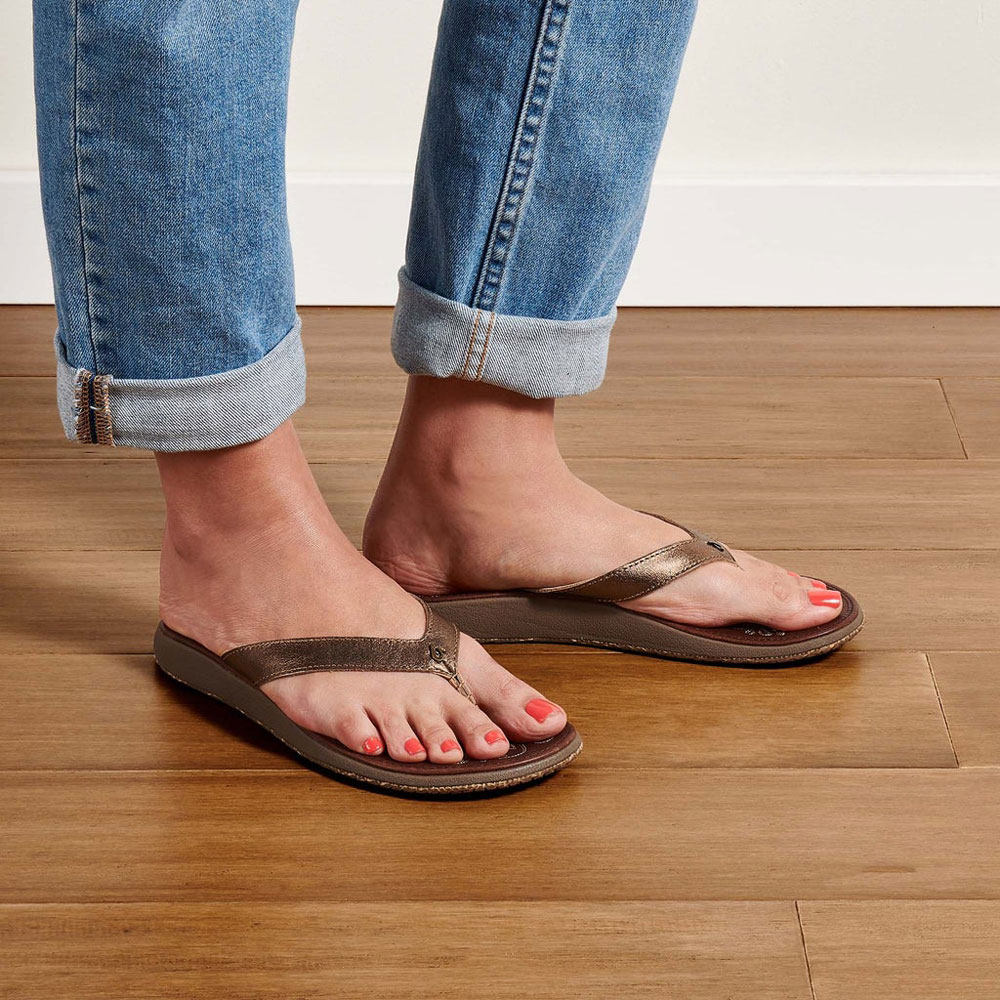 Paniolo betekent in het Hawaïaans ‘cowgirl’. De Olukai Paniolo slippers zijn gemaakt van volnerf leer van hoge kwaliteit. Ze zijn fraai gedecoreerd met een met de hand geborduurd patroon dat geïnspireerd is op zadels voor het paardrijden. Het zijn stijlvolle en heerlijk comfortabele slippers met een anatomisch gevormd voetbed. Ze geven veel ondersteuning aan de voet zodat je er de hele dag door erg prettig op kunt lopen. De zolen geven ook op natte ondergrond veel grip. Met de Pianolo heb je elegante slippers voor het strand en voor de stad.